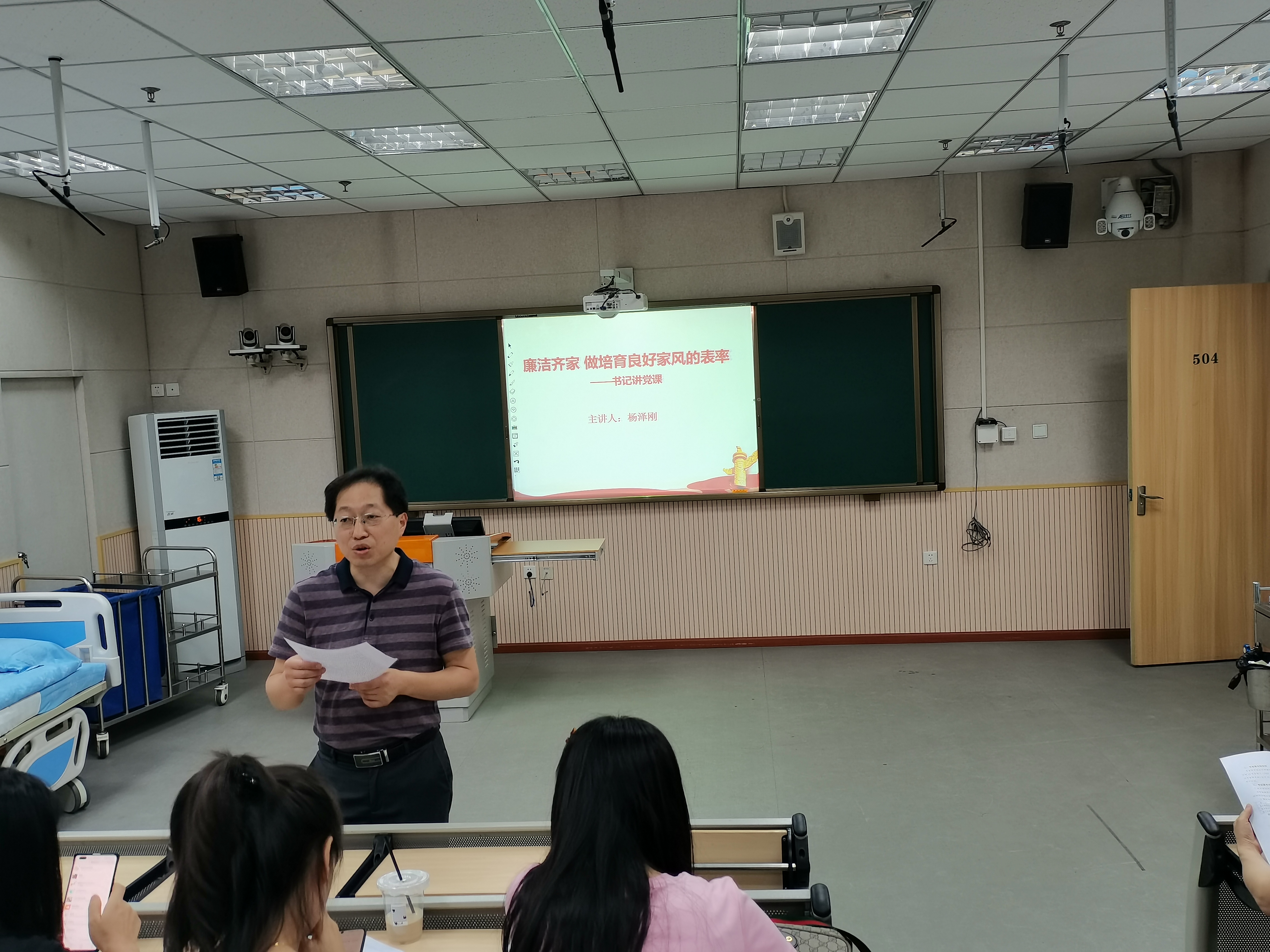 6月21日下午,护理公司党总支书记杨泽刚在青年路校区实训楼504教室为w66利来旗舰厅全体教职工开展了主题为《廉洁齐家 做培育良好家风的表率》的专题党课。