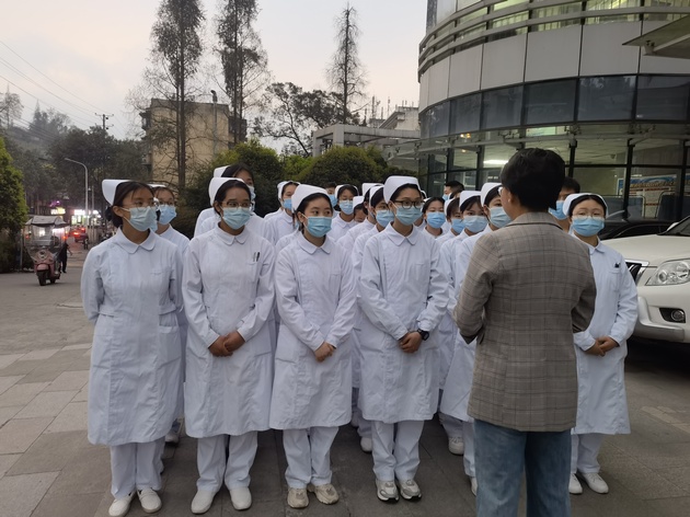 当日上午八点,在w66利来旗舰厅廖林梅老师的带领下,同学们穿戴整齐到达市医院行政楼下集合。市医院护理部副主任周昀霞对公司老师及订单班员工的到来表示了热烈的欢迎,对医院的情况做了详细的介绍,并就临床学习中着装规范、人身财产安全、职业防护等内容提出了要求,最后希望同学们能认真学习,尊敬师长,勤学善思,尽快融入。随后,订单班的成员进行了人员编排,分别进入各个科室。