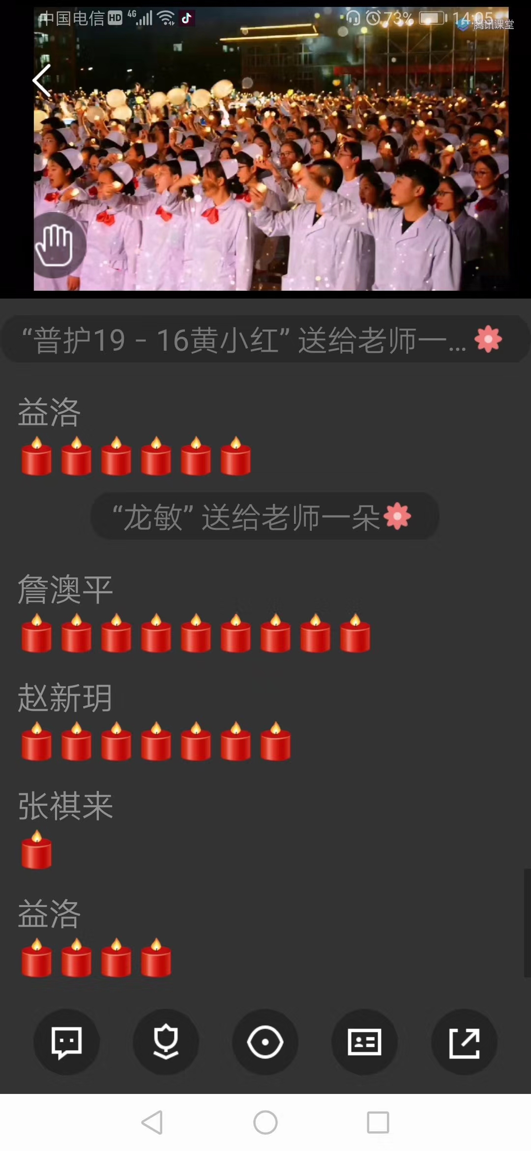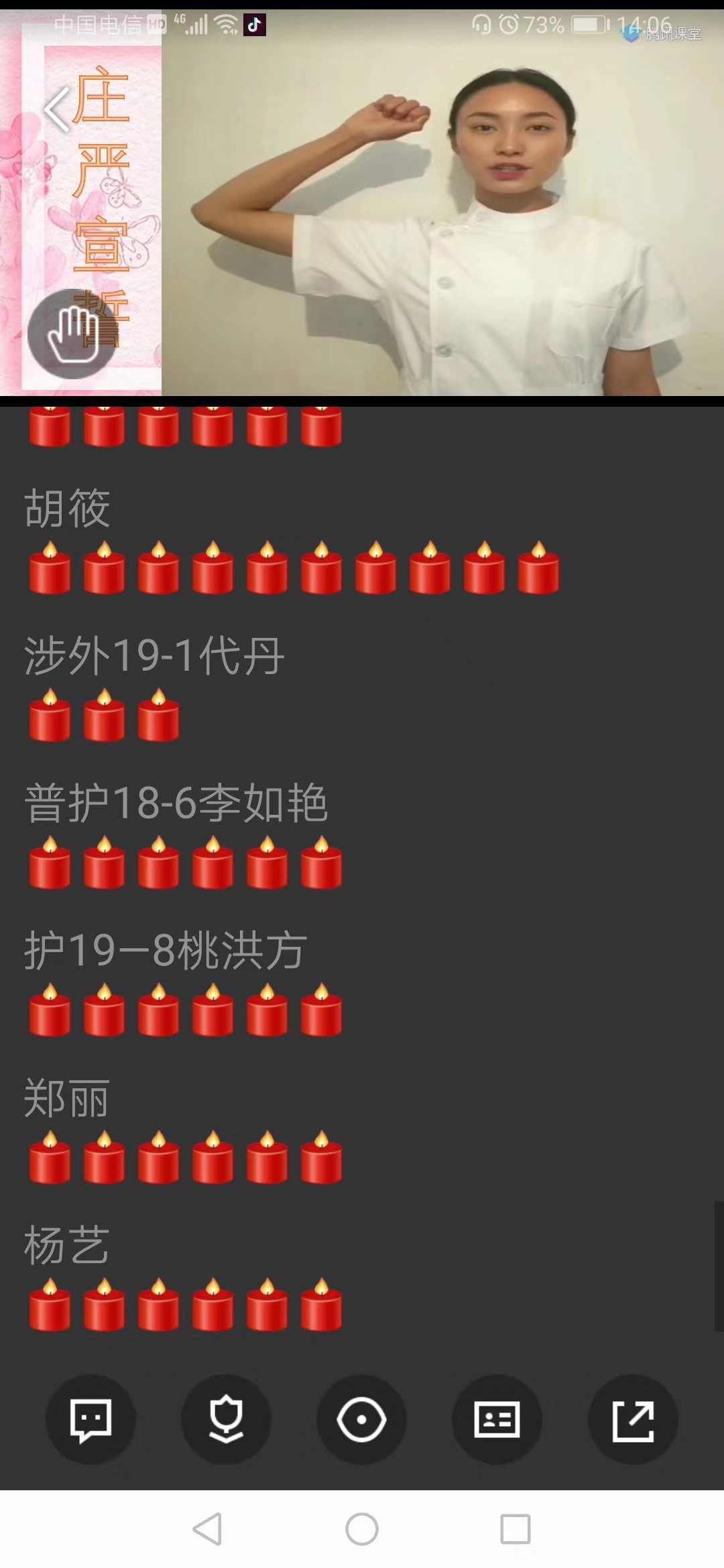 最后参与活动的全体师生庄严宣誓,在群接龙中点亮克里米亚天使之灯,活动氛围到达高潮。此次活动不仅弘扬了南丁格尔精神,激发了同学们的爱国热情,更是坚定了疫情防控的必胜信念。在展现护理学子良好风貌的同时进一步激发了同学们的理想信念和职业使命感。