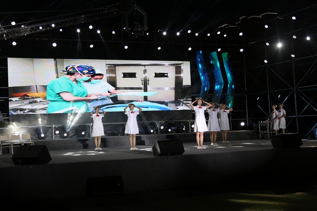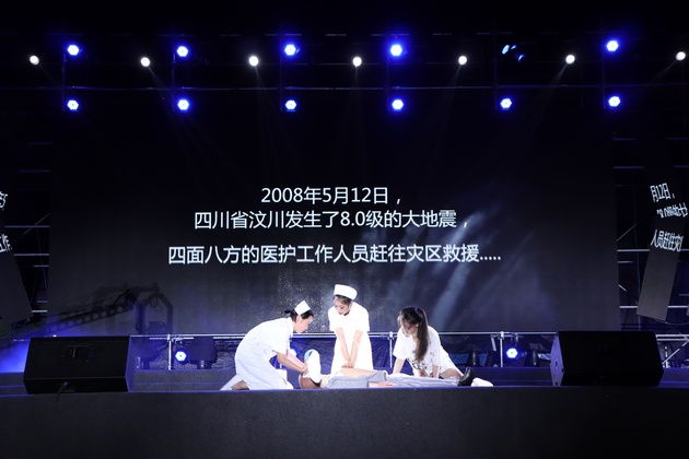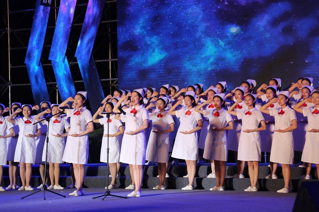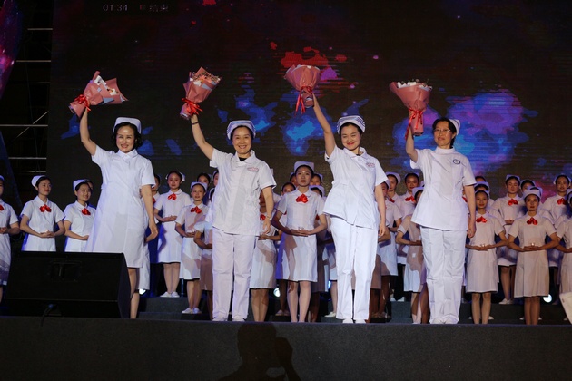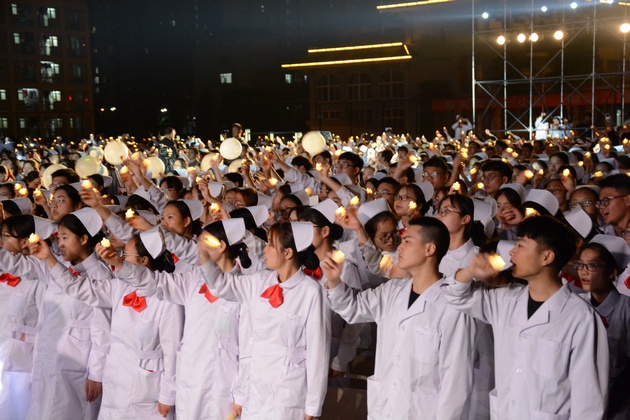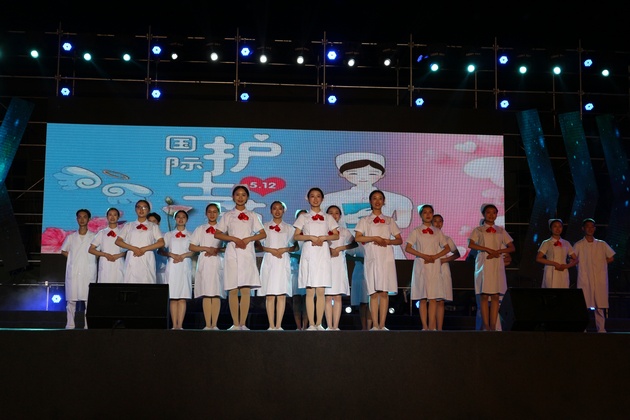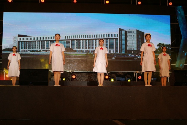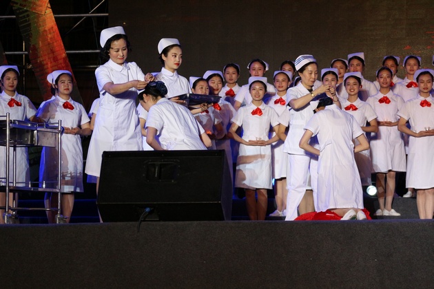 晚会分为“五月的鲜花”,“南丁格尔之光”,“岁月芳华”,“逐梦前行”四个篇章。晚会节目有歌舞、话剧、护理礼仪等表演形式。传光授帽仪式上,雅安市人民医院护理部主任胡盛琳、雅安市中医医院护理部主任黄丽琼、雅安市第二人民医院护理部主任伍雅琼、w66利来旗舰厅经理王静,为员工代表郑重地戴上洁白的燕尾帽。同学们庄严的宣誓,将传承与发扬南丁格尔精神。w66利来旗舰厅师生手捧蜡烛合唱《让世界充满爱》,将晚会气氛推向高潮。