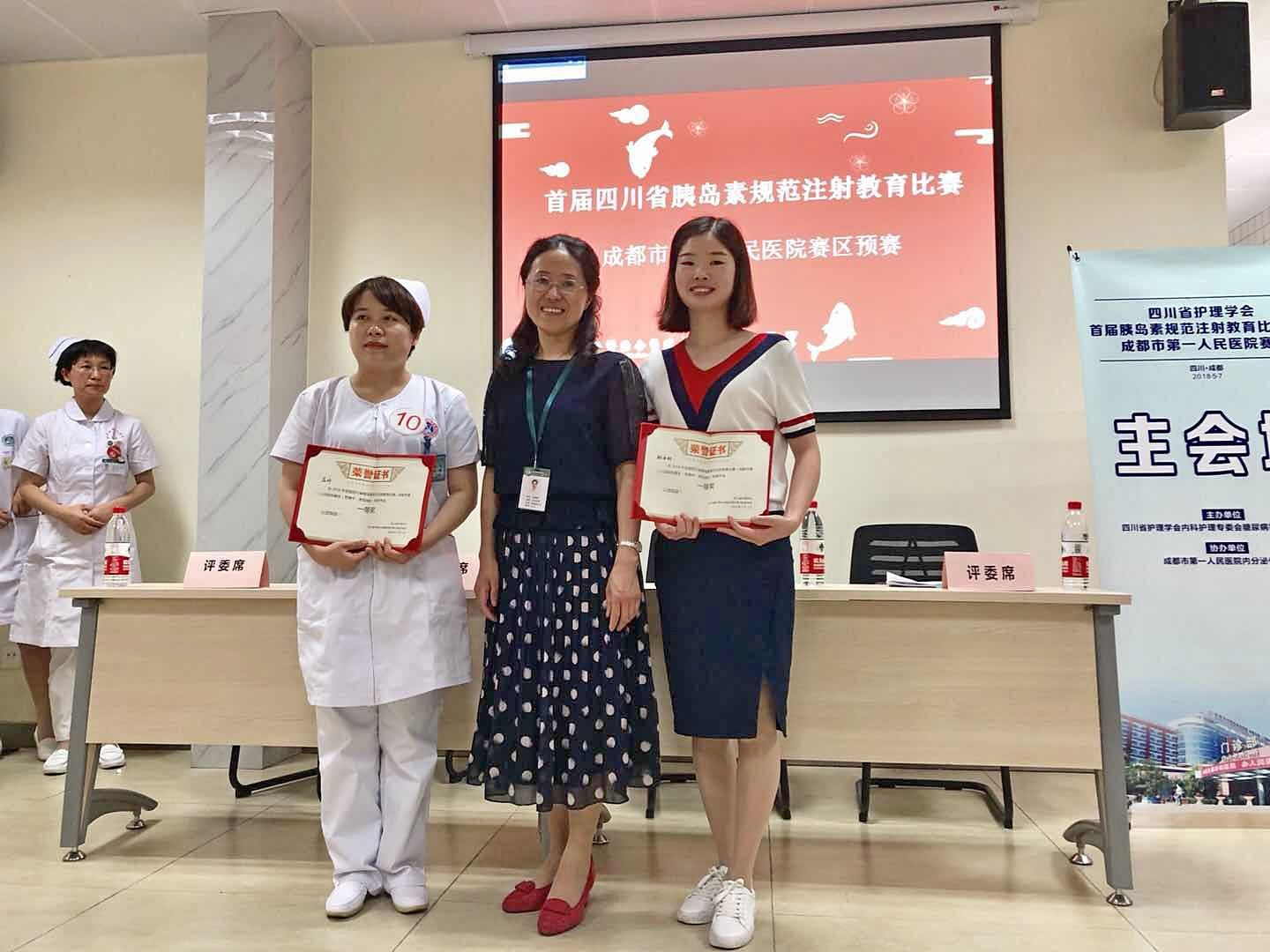 5月7日,由成都市第一人民医院举办的“四川省首届胰岛素规范注射教育比赛——西部赛区预赛”在成都市第一人民医院慢病管理中心二楼会议室隆重举行,雅职院附院糖尿病专科护士骆承娇代表公司参加了本次比赛,并获得一等奖。