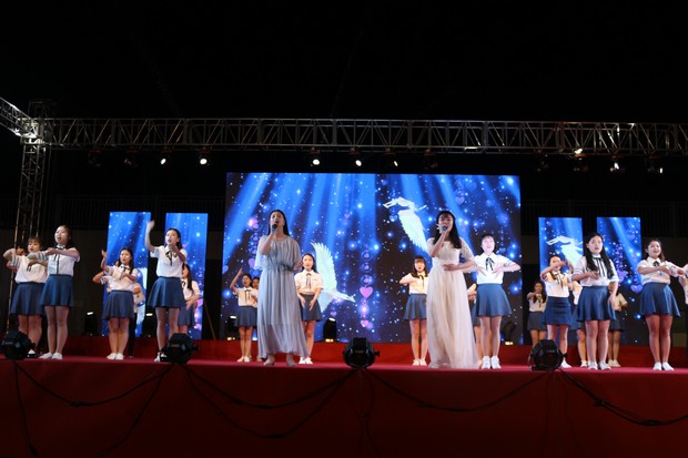 最后,在传光授帽仪式上护理系前辈们为护生们戴上圣洁的燕尾帽,大家庄严宣誓将继续发扬开拓创新、锐意进取的精神,展现新时代护理人员的风采。晚会即将结束时,下起了雨,全场一起唱起《让世界充满爱》,让晚会在十分让人感动的画面中圆满落幕。