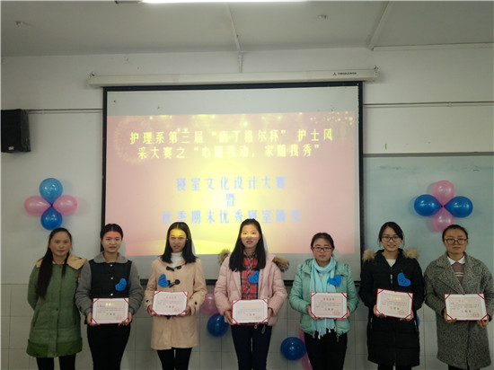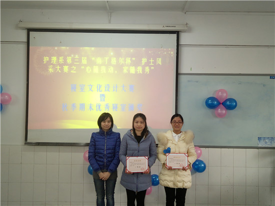 展宿舍文化,扬青春风采。12月20日12:30,护理系第三届“南丁格尔”杯护士风采大赛之“心随我动,家随我秀”寝室文化设计大赛决赛暨2016年秋季学期优秀寝室颁奖典礼在教学楼B205隆重举行。护理系团总支书记万黎,学管干事李杨、辅导员陈静出席并担任此次活动的评委。