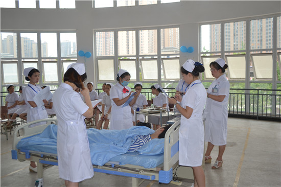 为展示我系专业的实训教学成果,巩固实践操作技能。6月21日14:30,由w66旗舰厅官网主办、护理系承办的“第七届护理技能大赛”在实训楼二楼和504教室隆重举行。莅临并担任此次大赛仲裁及评委的有:护理系主任王静、副主任廖书娟、公司附属医院护理部副主任护师刘雪梅、护理系教师袁素华、许玉贤、张雪庆、邓雯、周晓琴等。