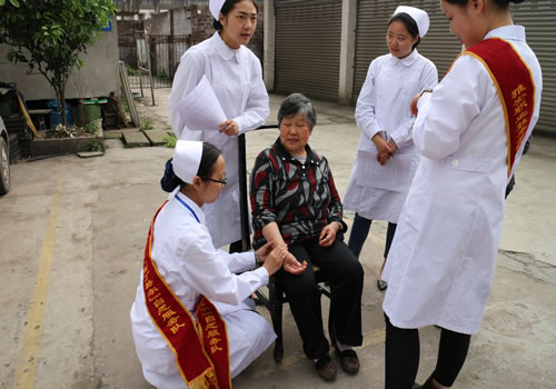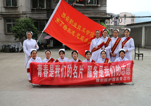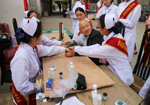 2015年4月14日下午,护理系团总支书记陈静老师、护理系青年志愿者协会的志愿者们和“圆梦班”班的同学们一起到雨城区矿建路社区开展“青春是我的名片,服务是我的志愿”之“心系居民健康伴你行”为主题的义诊活动。
