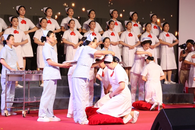 传光授帽仪式将整个活动推向高潮。黄丽琼、王青力、王成英、许玉贤、王静、陈俊六位护理领域的优秀前辈为员工代表郑重地戴上燕尾帽,象征着生命之光的蜡烛从前辈们手中次第点亮。员工们举起右手庄严宣誓,热爱护理事业,遵守护士的职业道德,一切以患者为中心,永葆白衣天使的圣洁。伴随着现场齐声合唱《让世界充满爱》,晚会在优美的旋律和温暖感人的氛围中圆满落下帷幕。