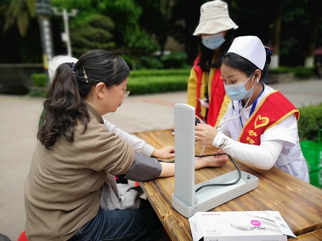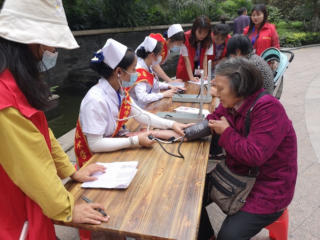 身着红色志愿服和白色护士服的志愿者们有序开展了义诊活动 。一部分志愿者负责调查回访,一部分志愿者细心的为居民测量血压,并进行了手指操和七步洗手法的讲解。志愿者热情的服务得到了居民们的一致好评。