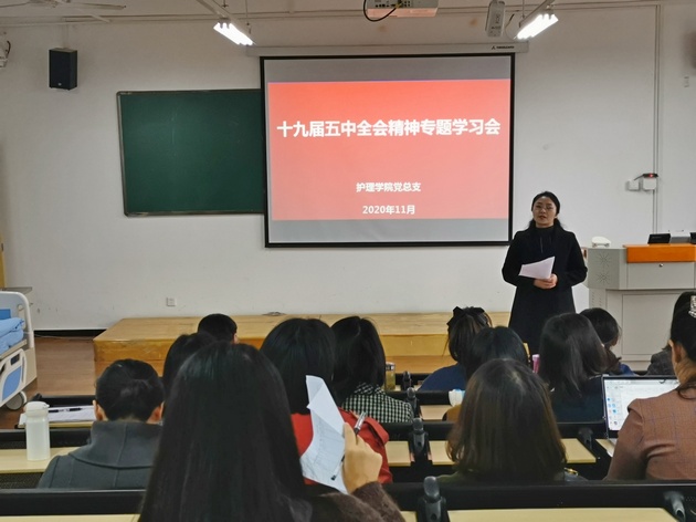 党的十九届五中全会召开后,护理公司党总支认真组织教职工学习贯彻会议精神。